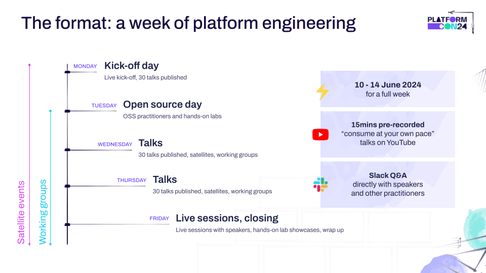 PlatformCon24 will be a full week of platform engineering! We will release the 90 talks we will select from 800+ (!!) submissions across 3 days, to give everyone enough time to watch them and discuss them with the speakers. Quality over quantity baby.